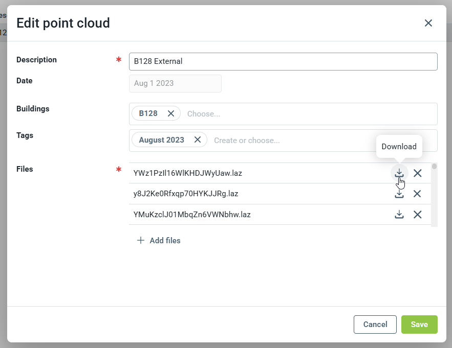 Tím se otevře mračno bodů a každý soubor lze stáhnout kliknutím na ikonu .
