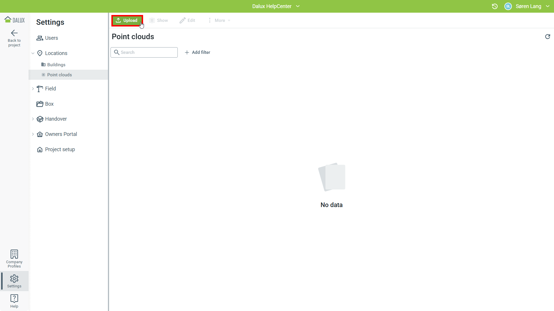Administrátoři projektu, design manažeři a skupiny uživatelů s oprávněním 'Upravit' pro Lokace mohou spravovat mračna bodů.