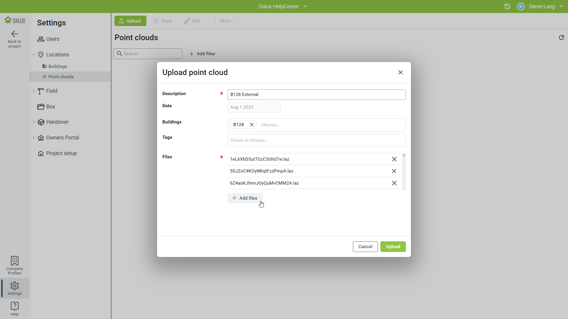 Současně lze nahrát jeden nebo více souborů mračen bodů. Po nahrání mračen bodů, Dalux soubory před jejich použitím zpracuje.