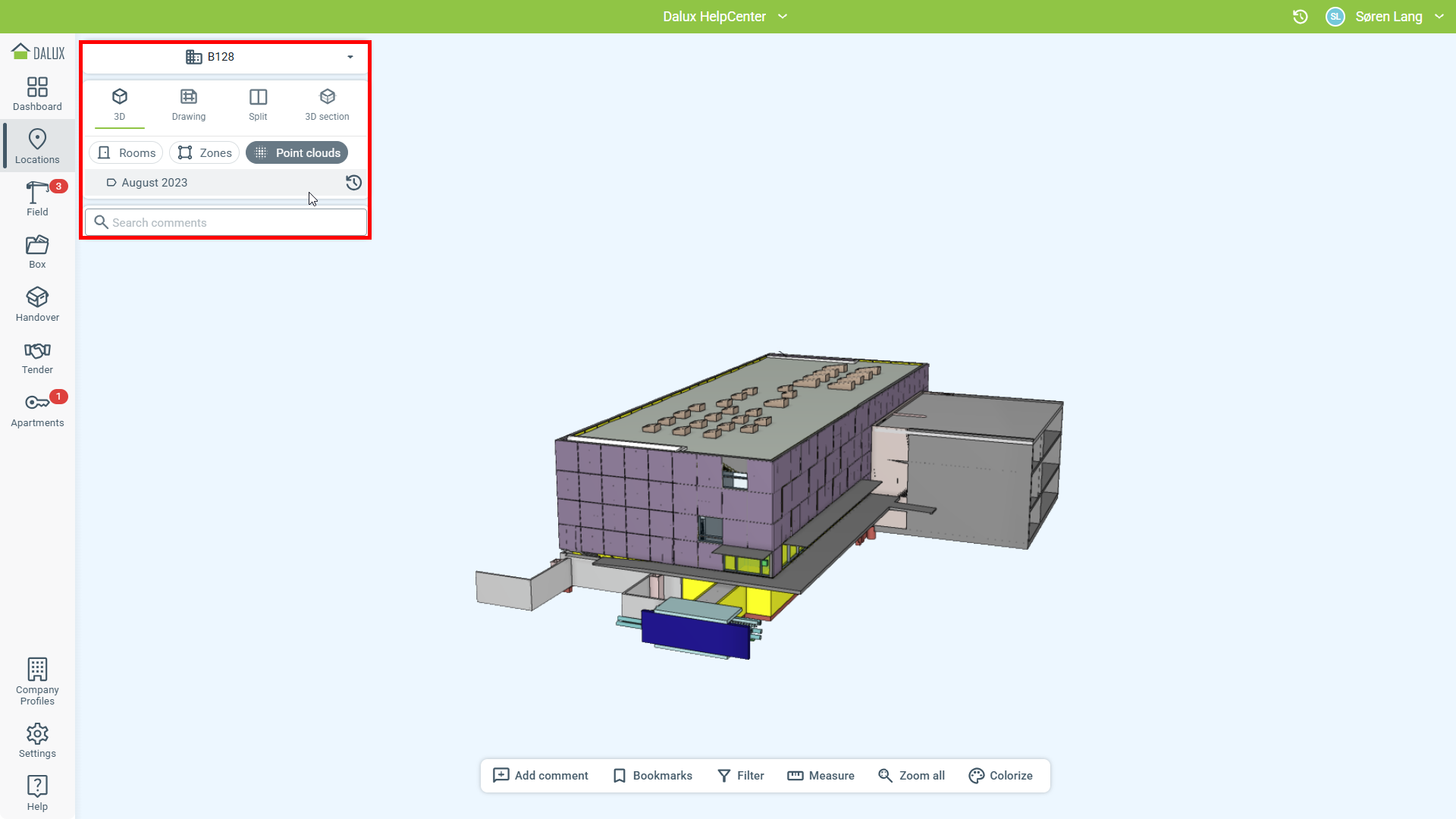 Přejděte na modul Lokace a vyberte budovu spojenou s mračnem bodů.