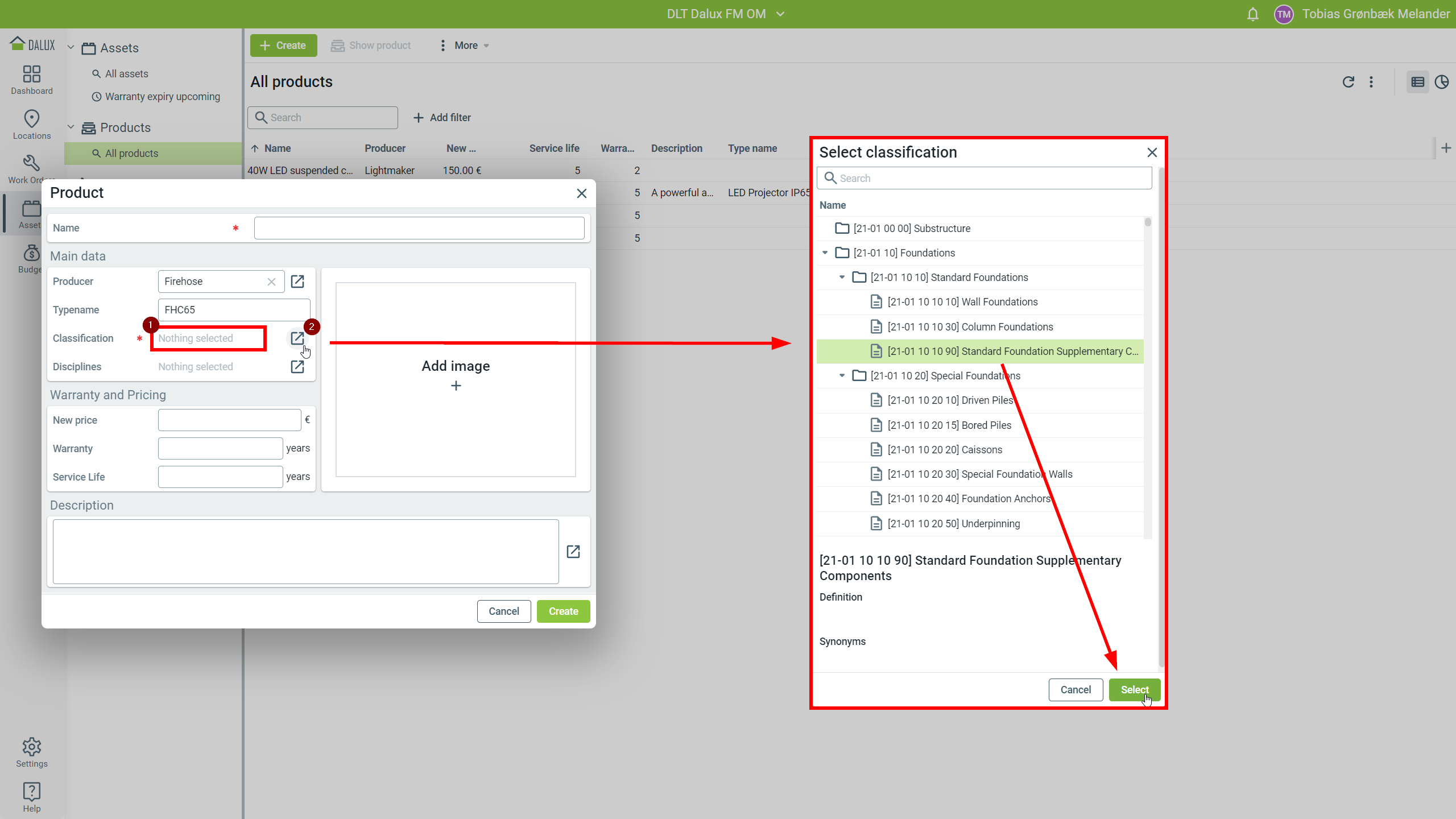 Classifications are used to categorize products and assets for sorting and filtering, and to determine the properties of assets. They are usually based on a local standard such as SFB, Uniclass, or CCS. When selecting a classification, you can use the search to quickly find what you are looking for.