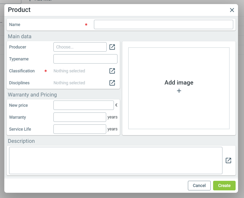 - Main data: Product name, producer, typename, classification, discipline, and image