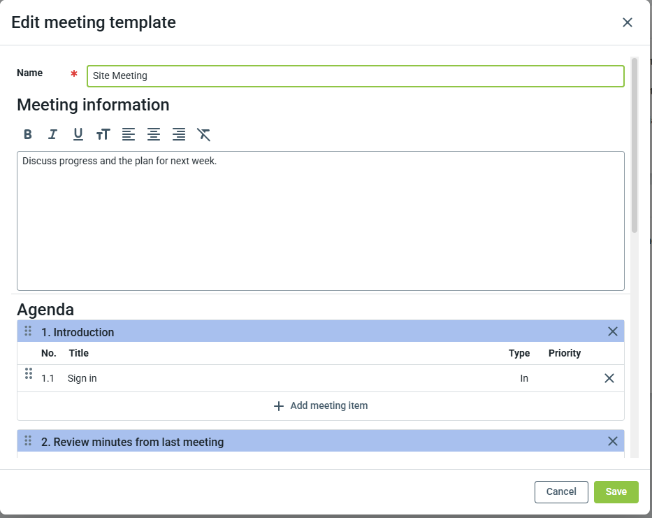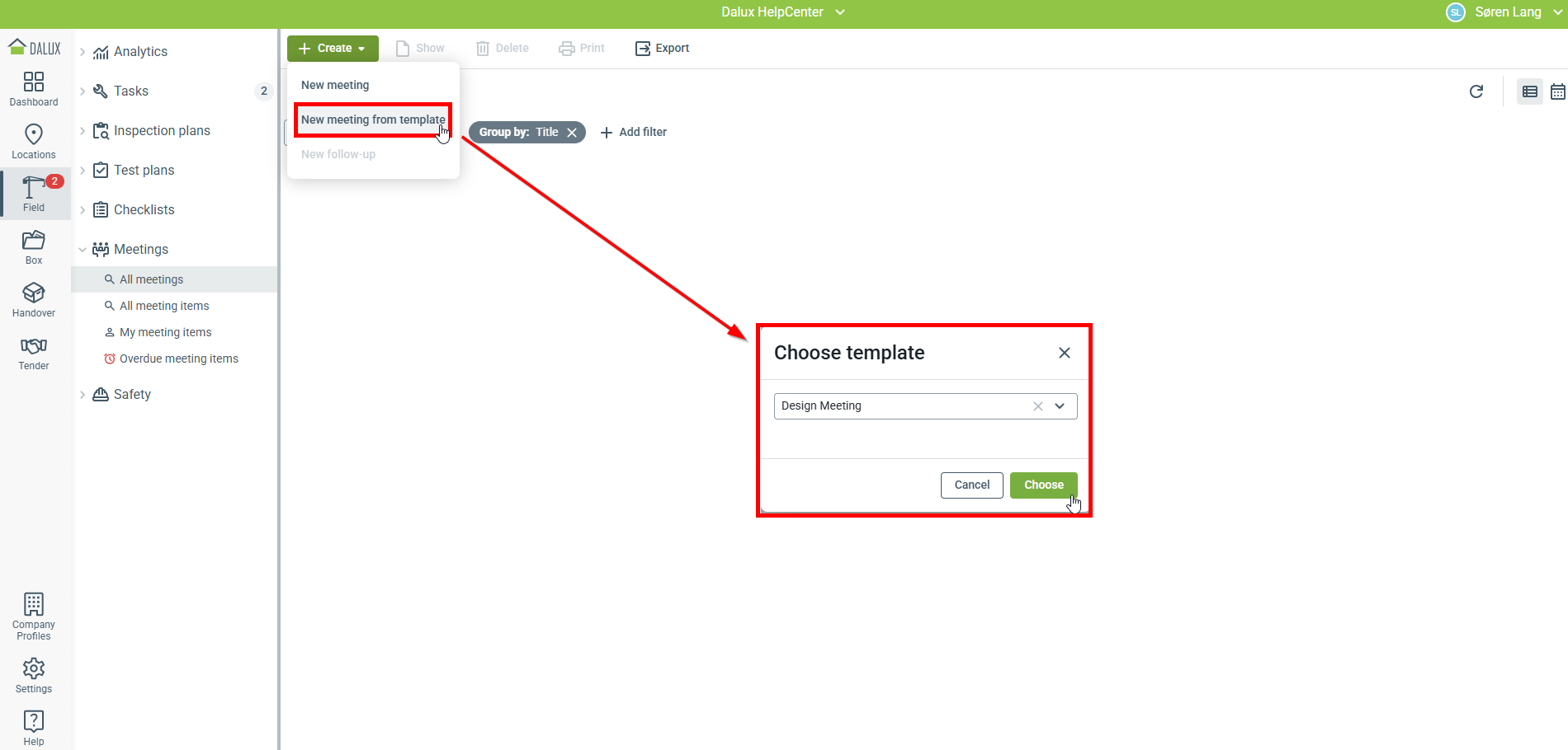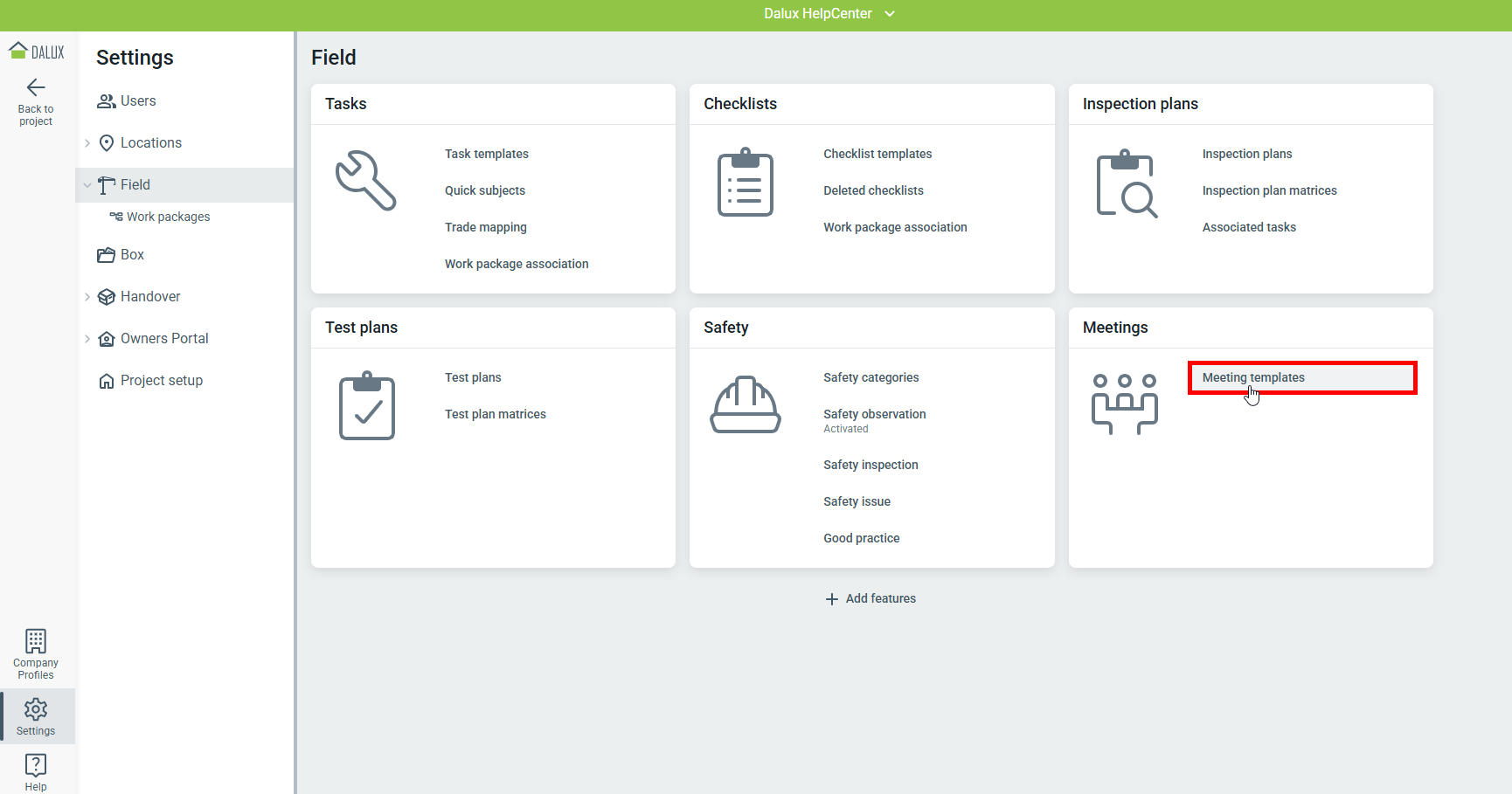 Koosoleku mallide abil on võimalik kasutada päevakorda mitmesuguste koosolekute tüüpide jaoks. Mallid saab luua projekti administraator Field/Boxi seadetes.
