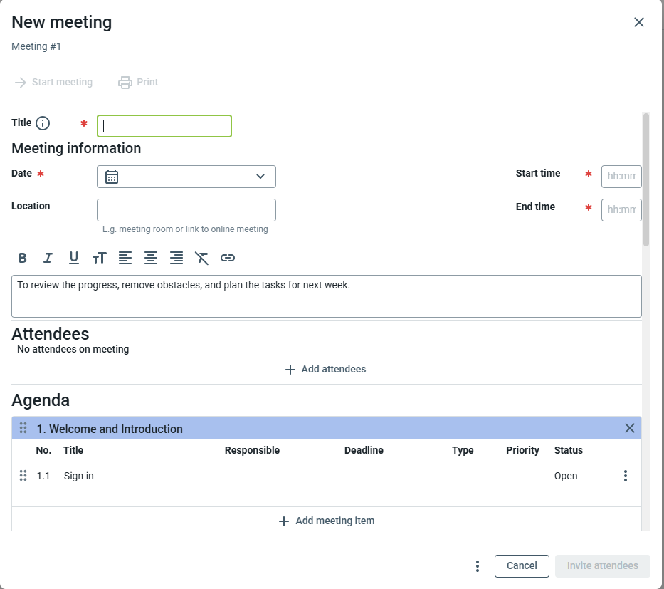 See avab tühja mustandi koosolekuks, millel ei ole päevakorda ega kirjeldust. Siin saate kohandada koosoleku asukoha, kuupäeva jne.