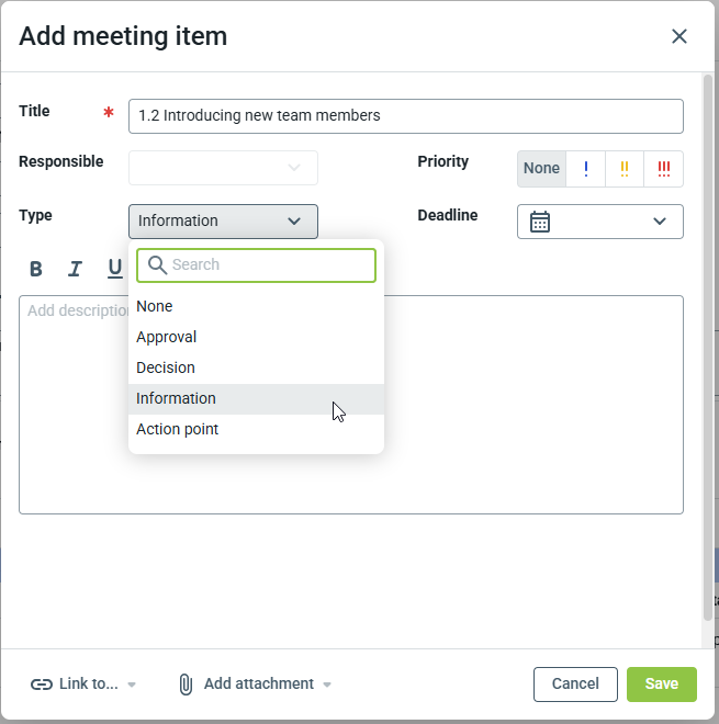 Koosoleku teemad kirjeldavad erinevaid teemasid, mida tuleb koosoleku ajal arutada. Koosoleku teemade loomisel saate redigeerida:
