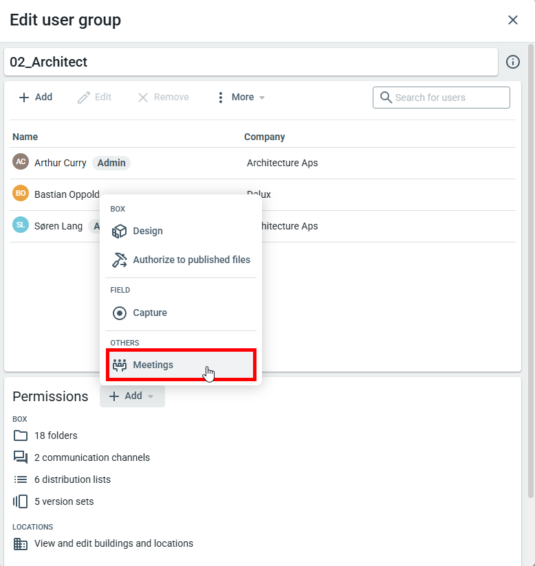 'Vaade' või 'Redigeeri/loo järelkontrolle' lubasid konkreetsete koosolekute jaoks, kontrollitakse kasutajagrupid. Lubade seadmiseks mine:
