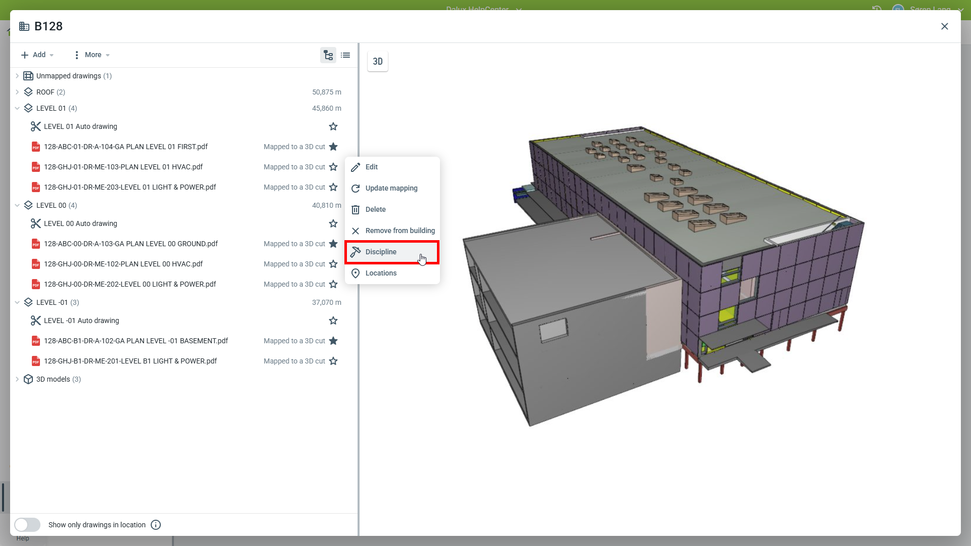 Sélectionner un plan sur le bâtiment et cliquez sur l'icône à côté du nom du plan, puis cliquez sur 'Disciplines':