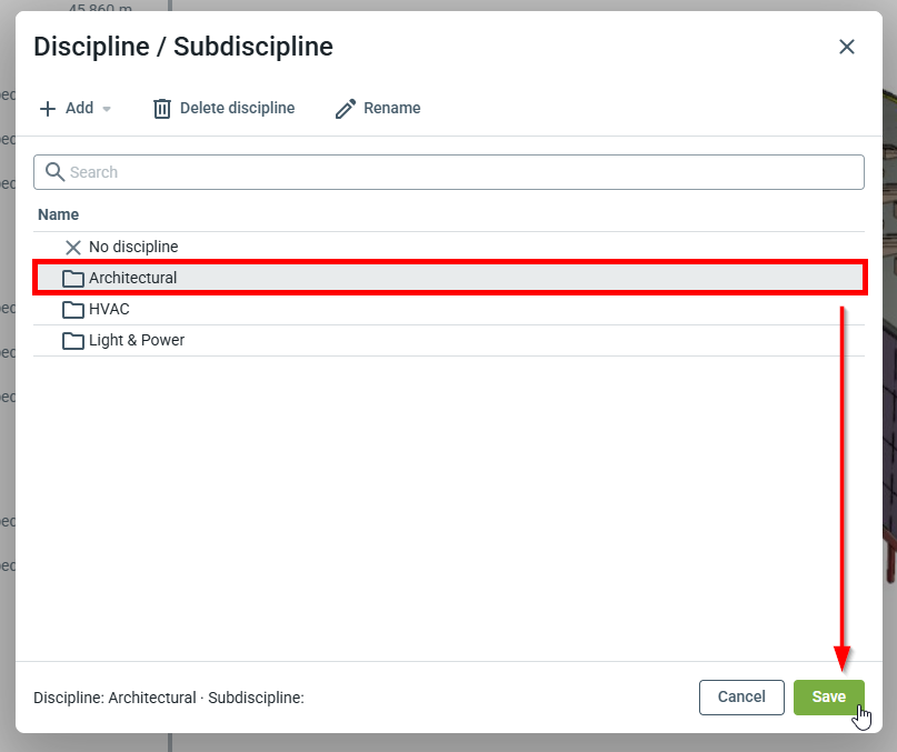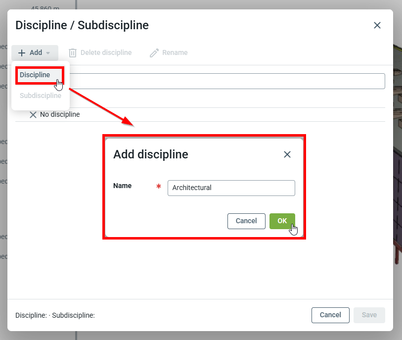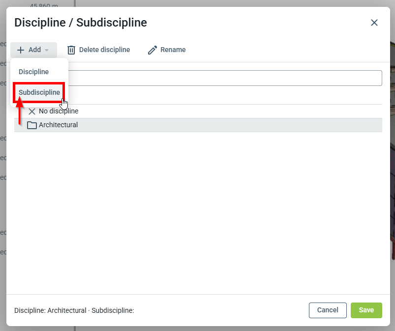 Les disciplines et sous-disciplines peuvent également être créées lors de la création ou de la modification de nouveaux bâtiments pour le projet. Les disciplines et sous-disciplines sont étendues à l’ensemble du projet et, une fois créées, peuvent être utilisées sur n'importe quel bâtiment du projet.