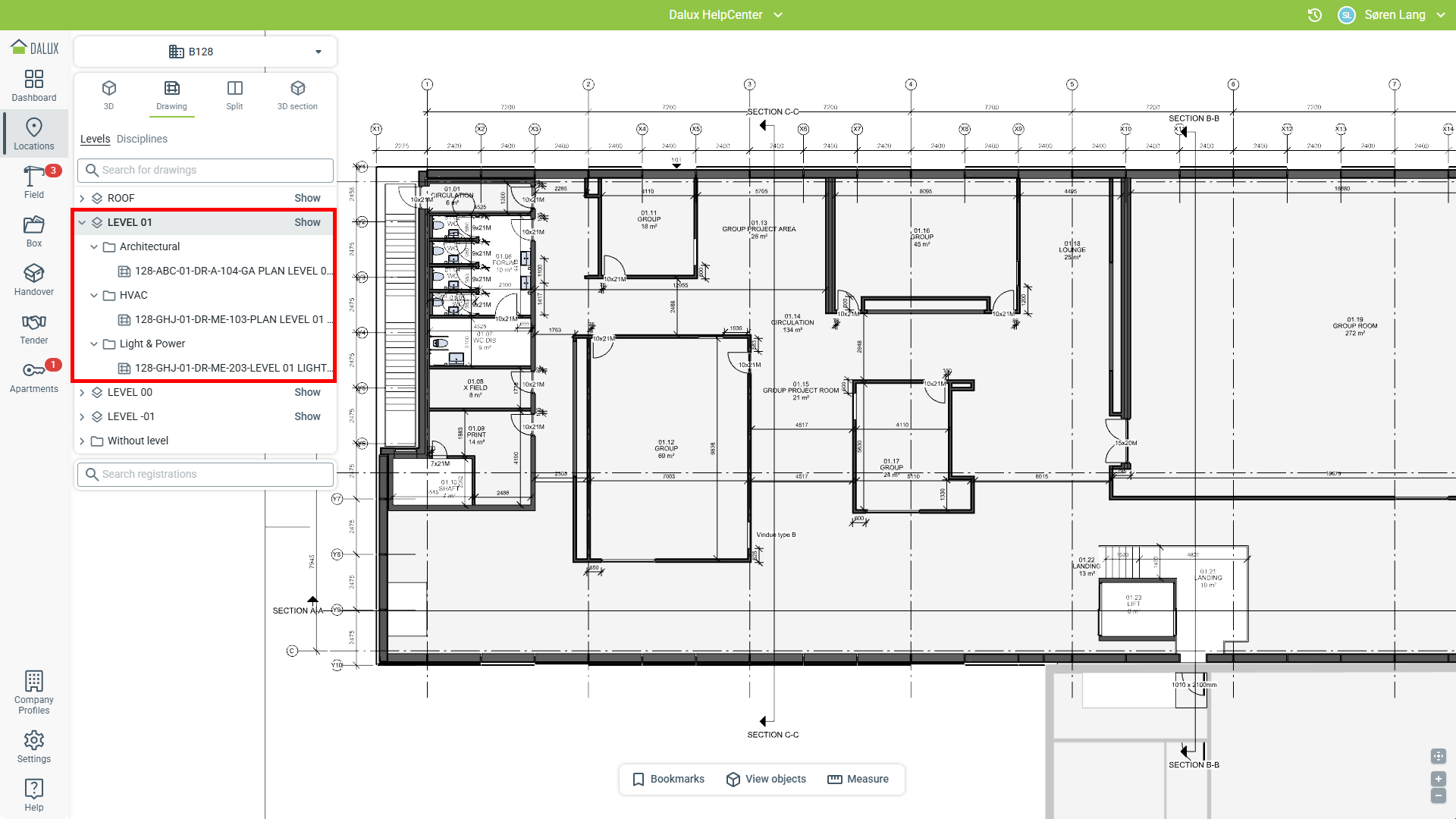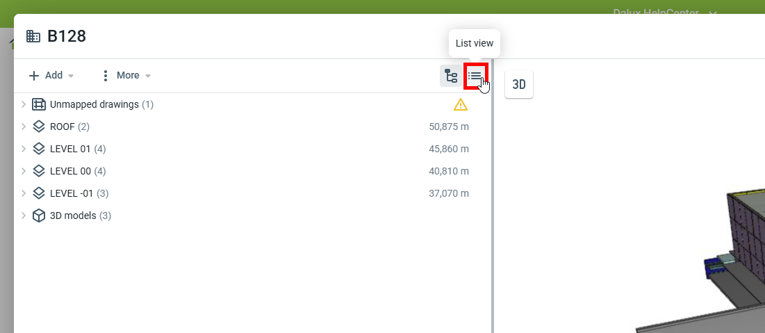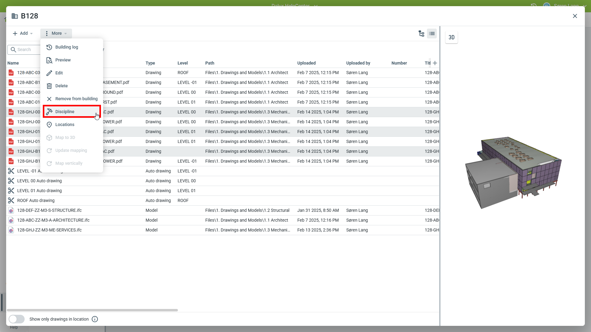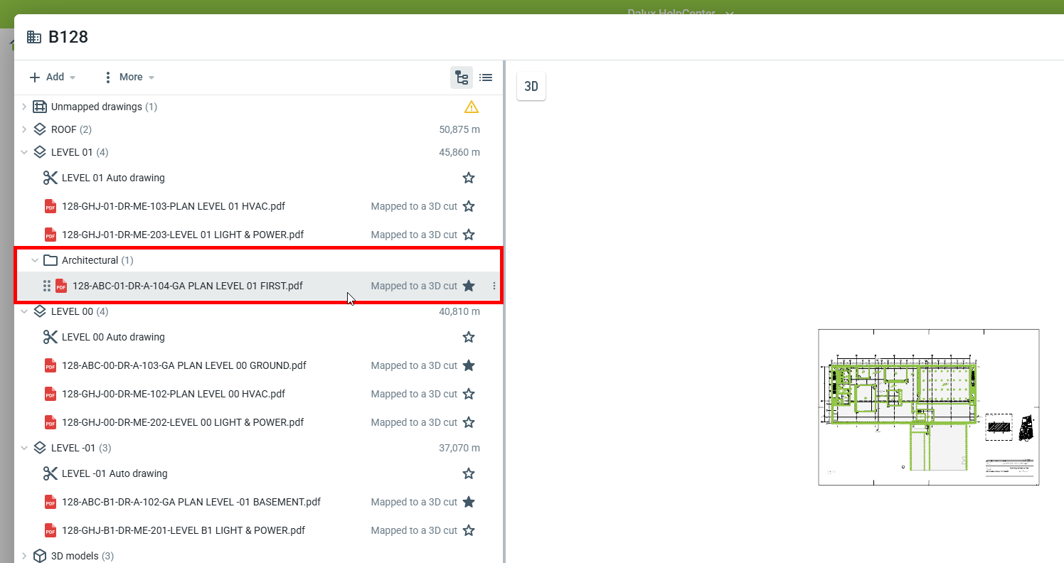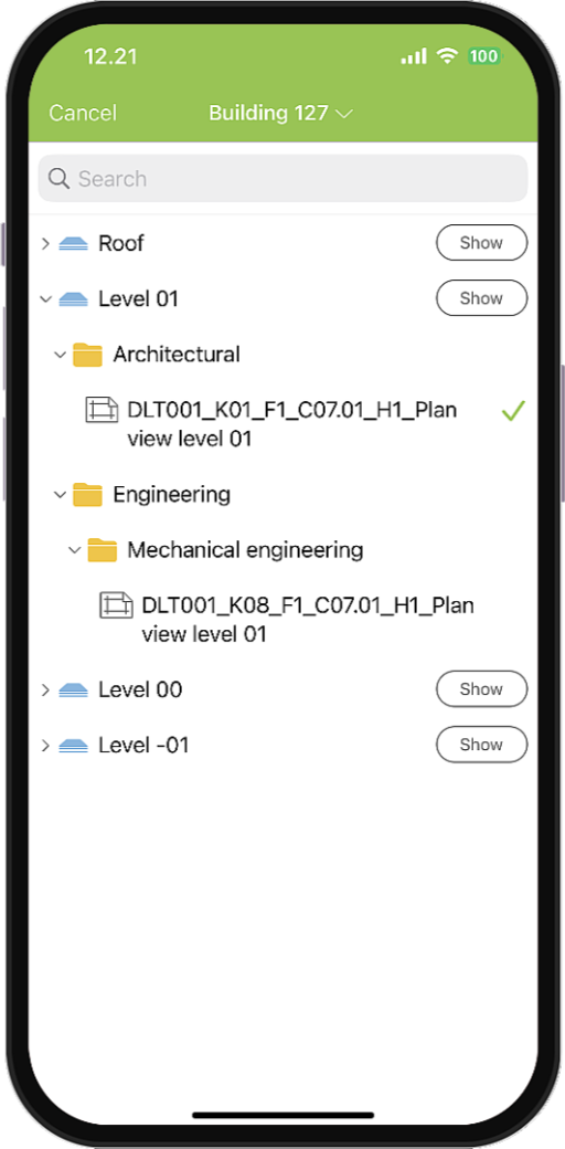 Lorsque vous visualisez le bâtiment dans le module Position, les plans seront désormais triés dans des dossiers pour chaque discipline. Ceci est affiché à la fois sur l'application bureau et sur mobile. Ceux-ci sont vus en allant à