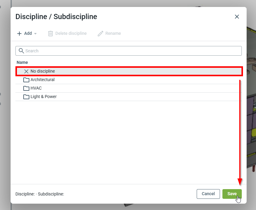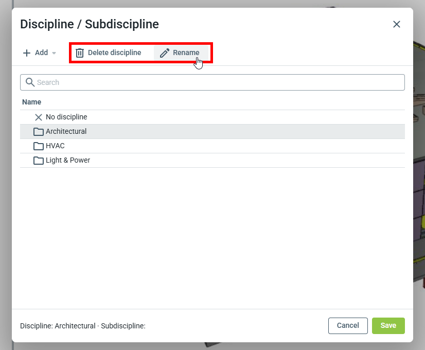Note: Renommer ou supprimer ne change pas les données sur les plans existants. Cela signifie que les plans doivent être déliés ou réassignés à une discipline différente/renommée.