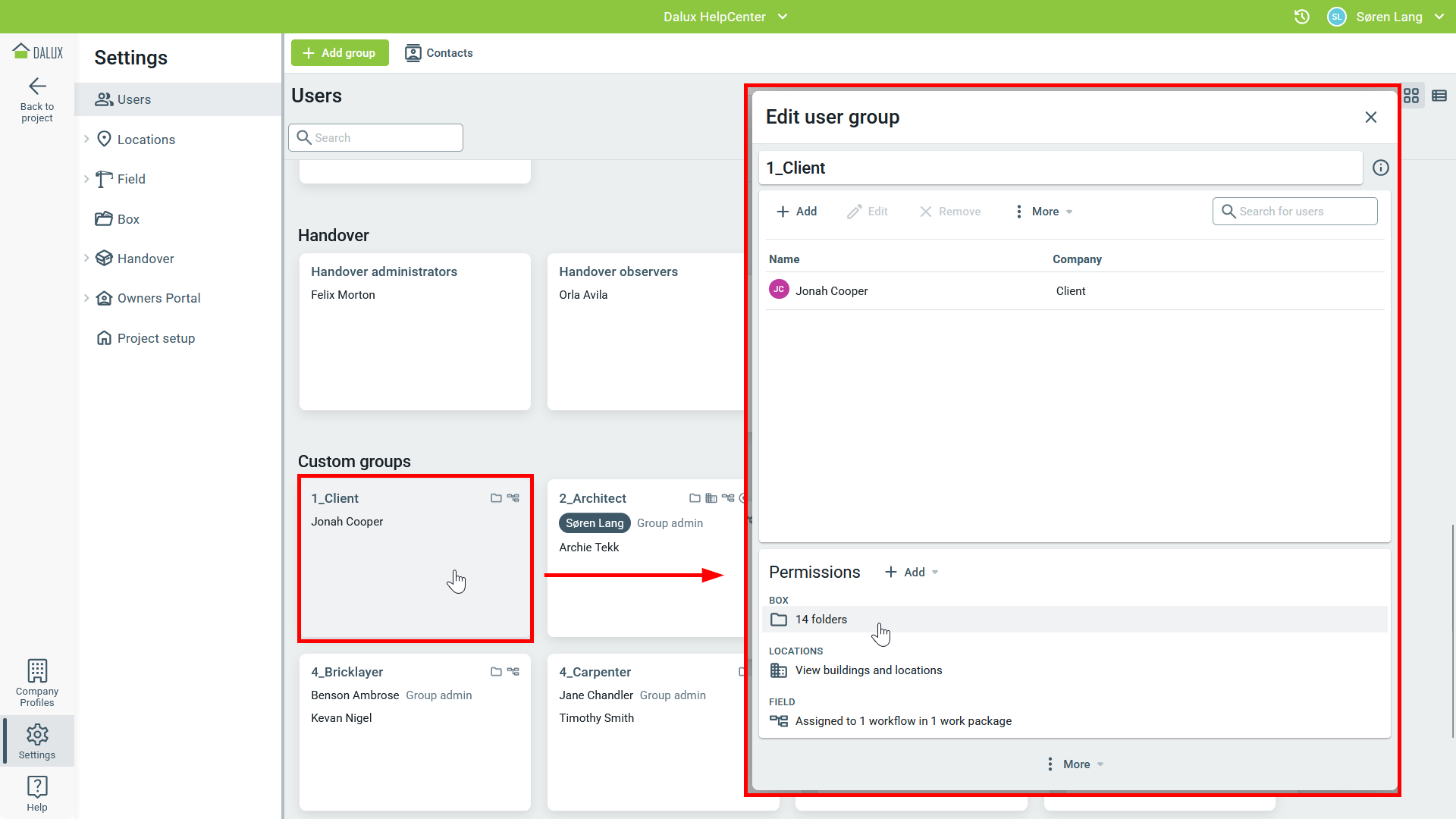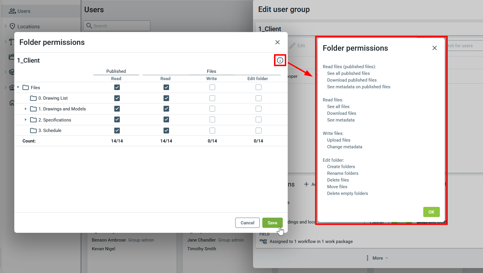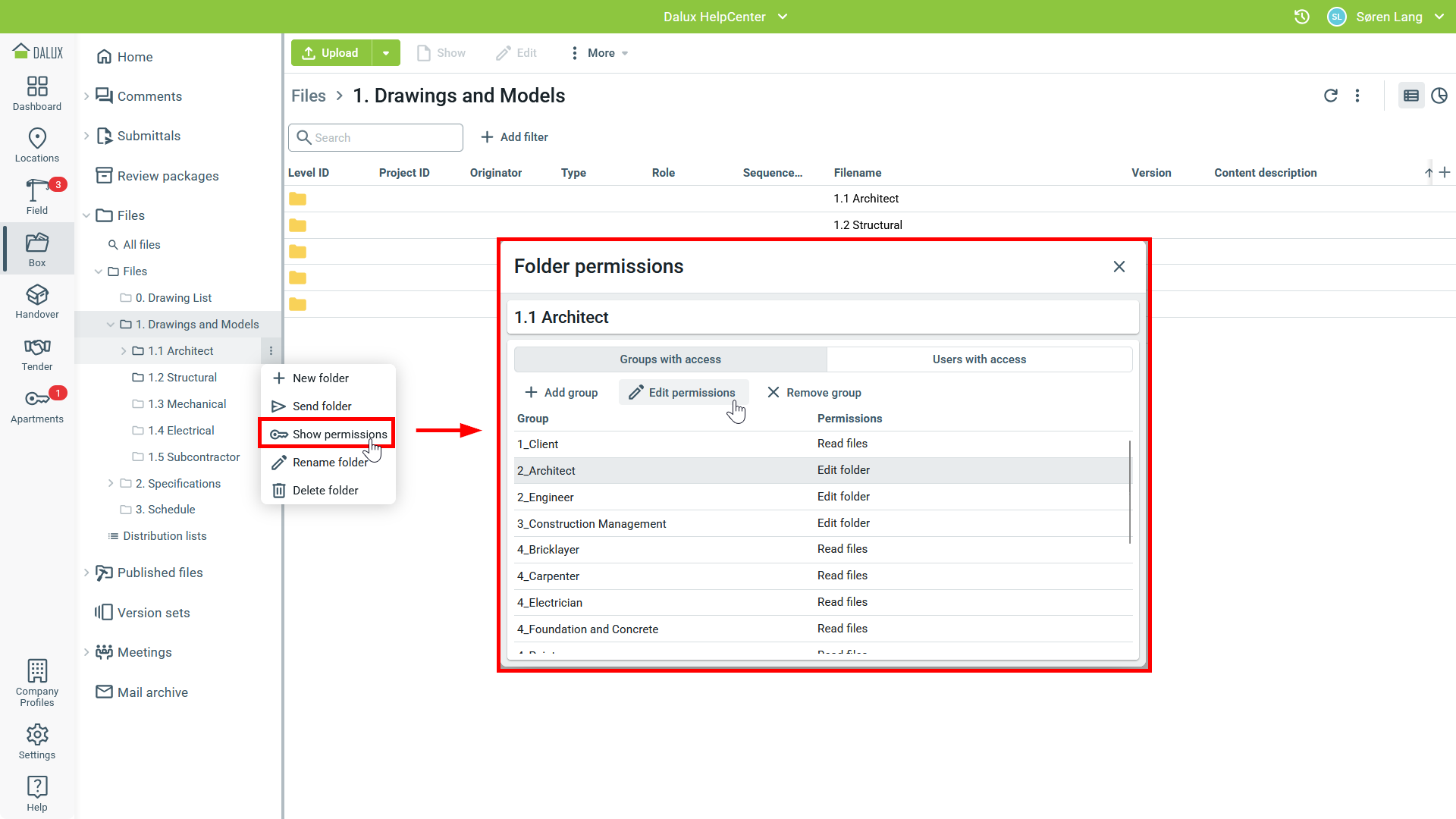 Gestisci il flusso di informazioni nel progetto in Dalux Box. Concedi ai singoli utenti l'Accesso per caricare, vedere o modificare file all'interno del progetto. I permessi saranno diversi da gruppo di utenti a gruppo di utenti in quanto dipendono dal ruolo del gruppo di utenti nel progetto.