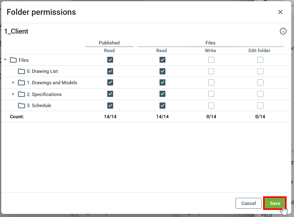 Seleziona le caselle per le cartelle a cui il gruppo di utenti scelto necessita accesso e clicca ‘Salva’.
