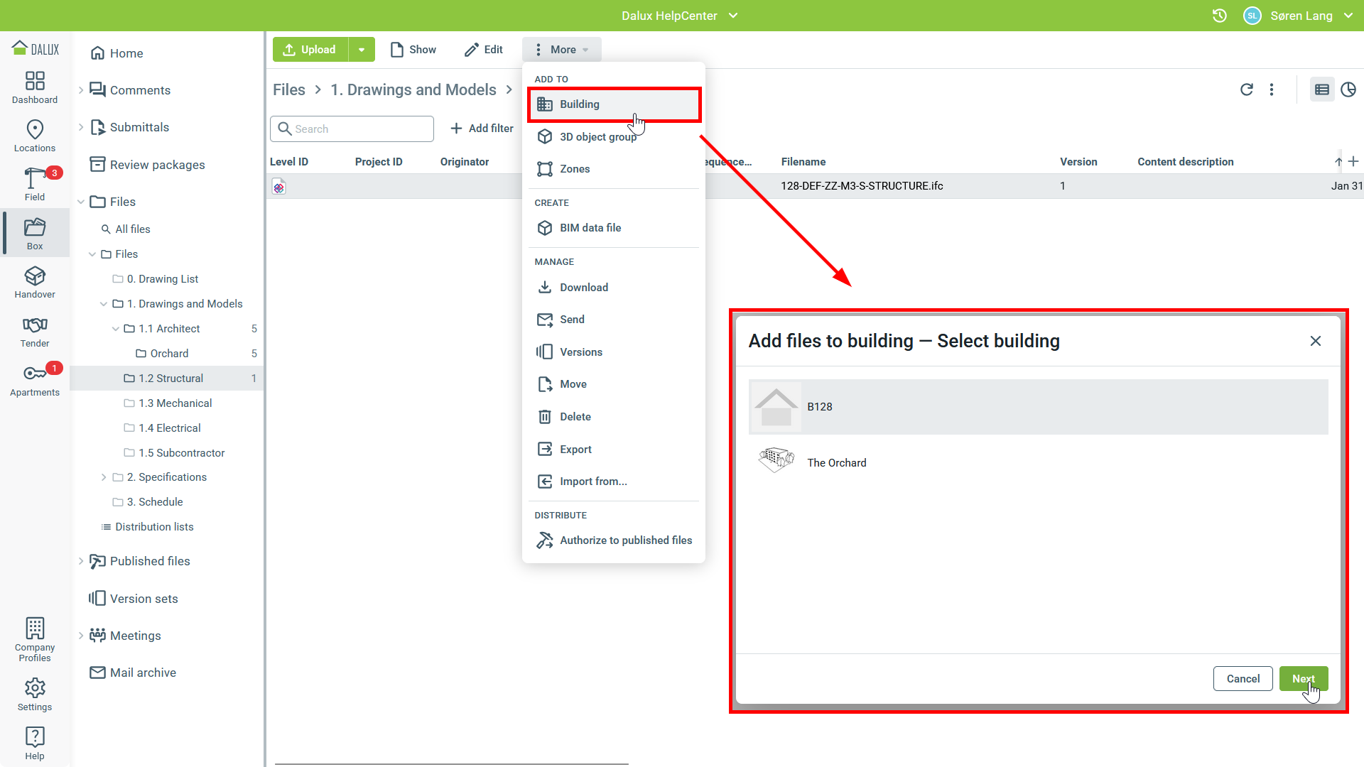 I file modello IFC e i disegni 2D possono essere collegati direttamente agli edifici dalla Box. Per aggiungere il file: