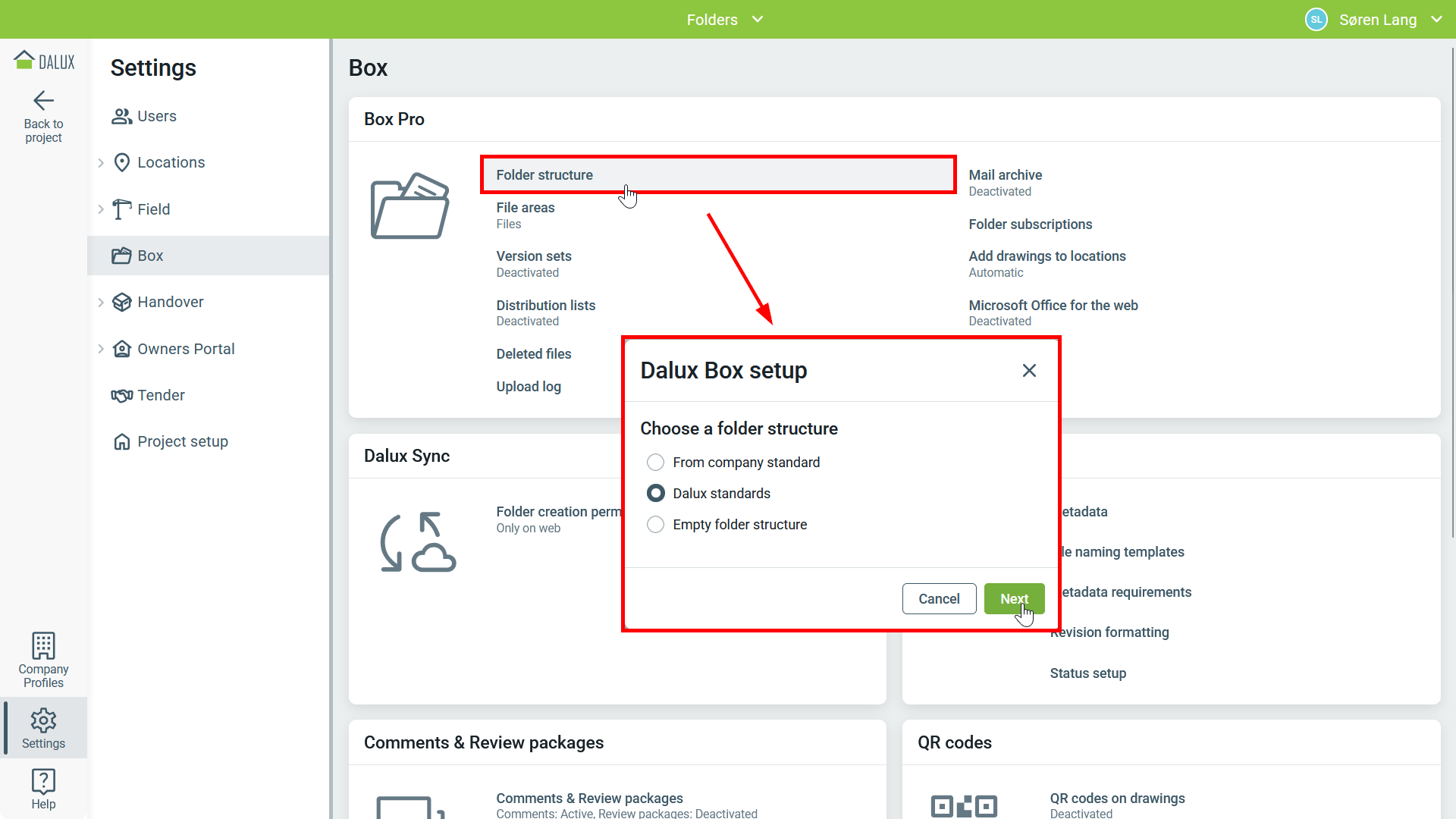 Questo articolo descrive la configurazione di base per Dalux Box. Dalux Box è un ambiente di dati comune e può essere utilizzato per la gestione e la condivisione dei file tra le diverse persone del progetto.