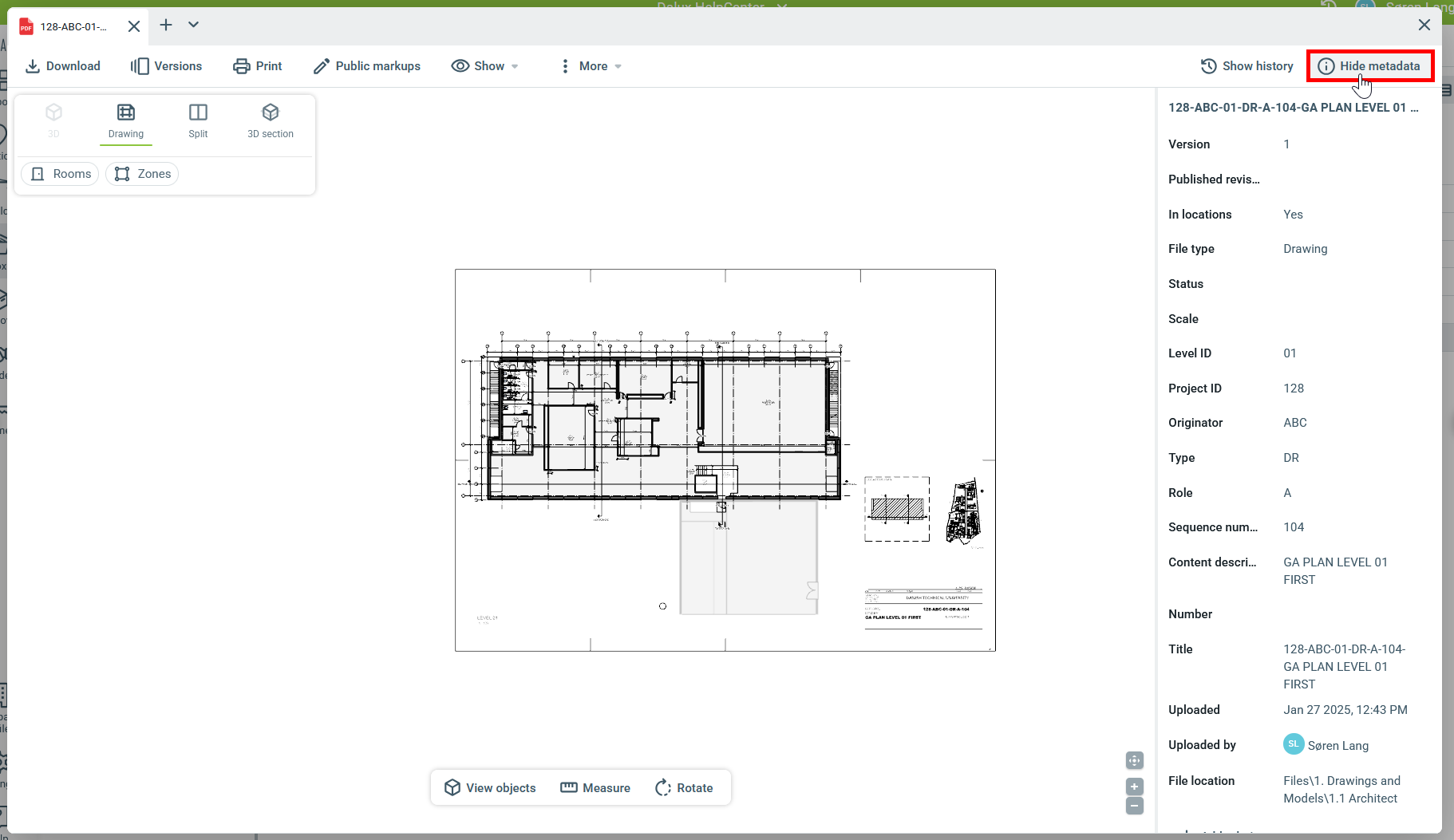 Quando un file è aperto in Dalux Box, i metadati/informazioni sul file possono essere visualizzati cliccando l'icona Mostra metadati/ sulla destra. Da questo pannello, possono essere visualizzate informazioni sul file. A seconda del tipo di file, è possibile modificare diversi campi.