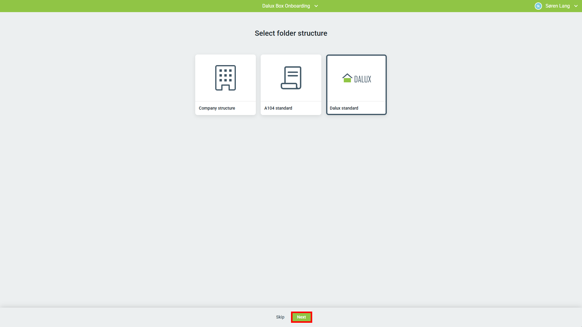 Nei nuovi progetti che non utilizzano un progetto standard, Dalux può aiutarti a configurare la tua struttura della cartella e i gruppi di utenti. Puoi utilizzare la procedura guidata o saltare questo processo. Se vuoi seguire la guida, clicca 'Dalux standard' e poi 'Avanti'.