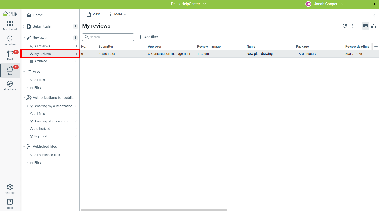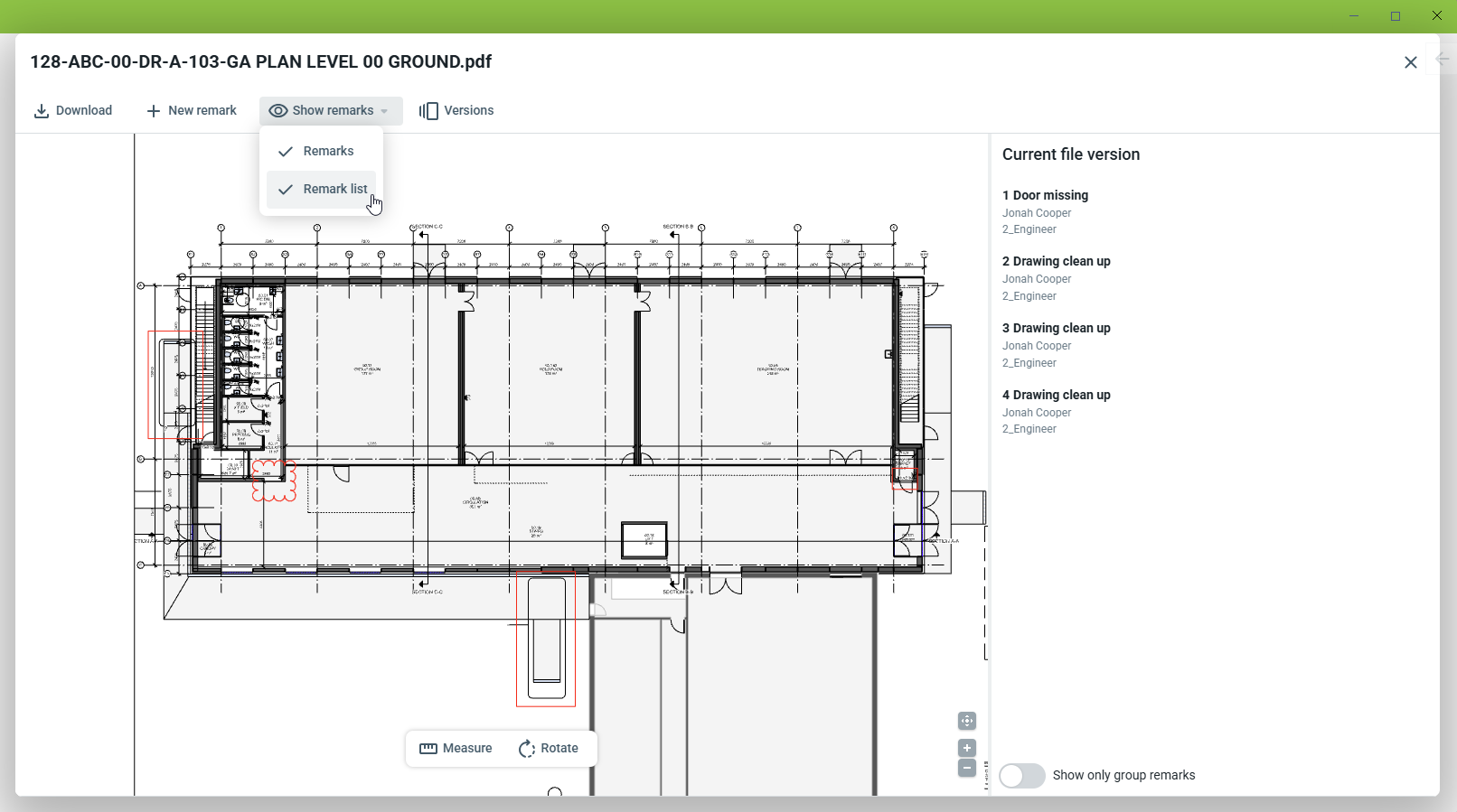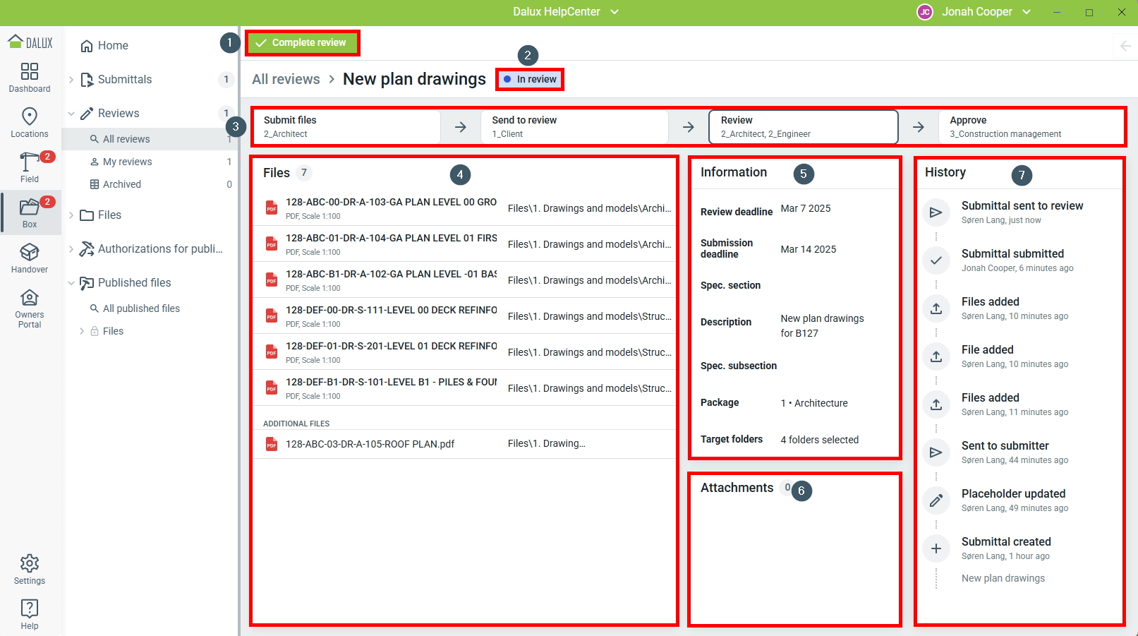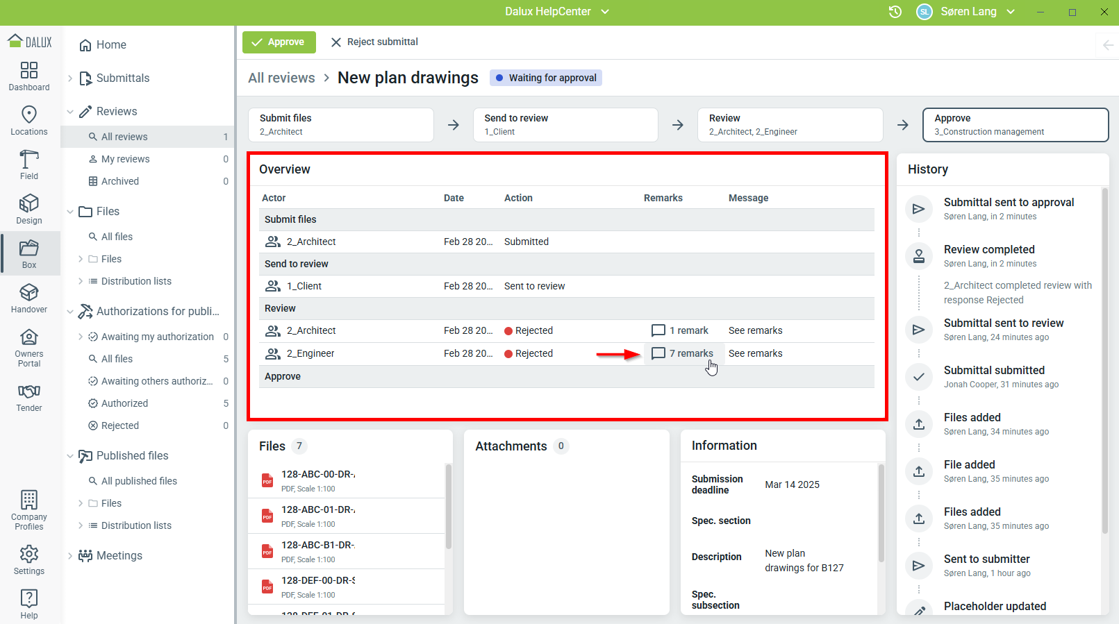 Projectbeheerders, projectmanagers en submittal managers kunnen de beoordeling en de opmerkingen/markups bekijken.