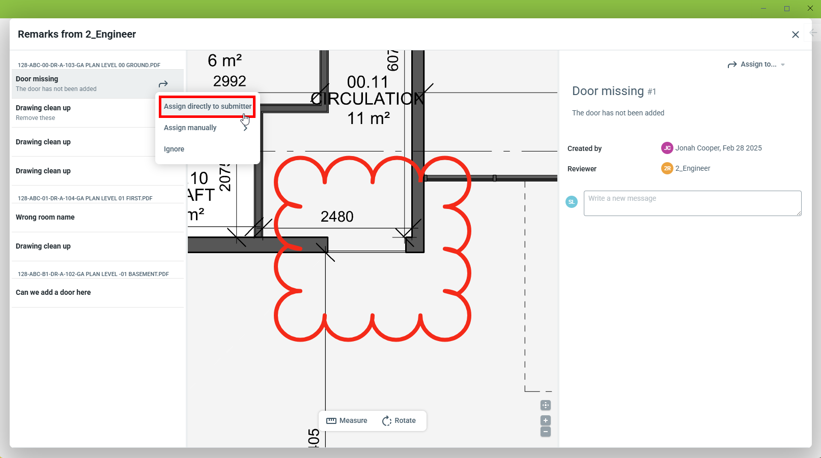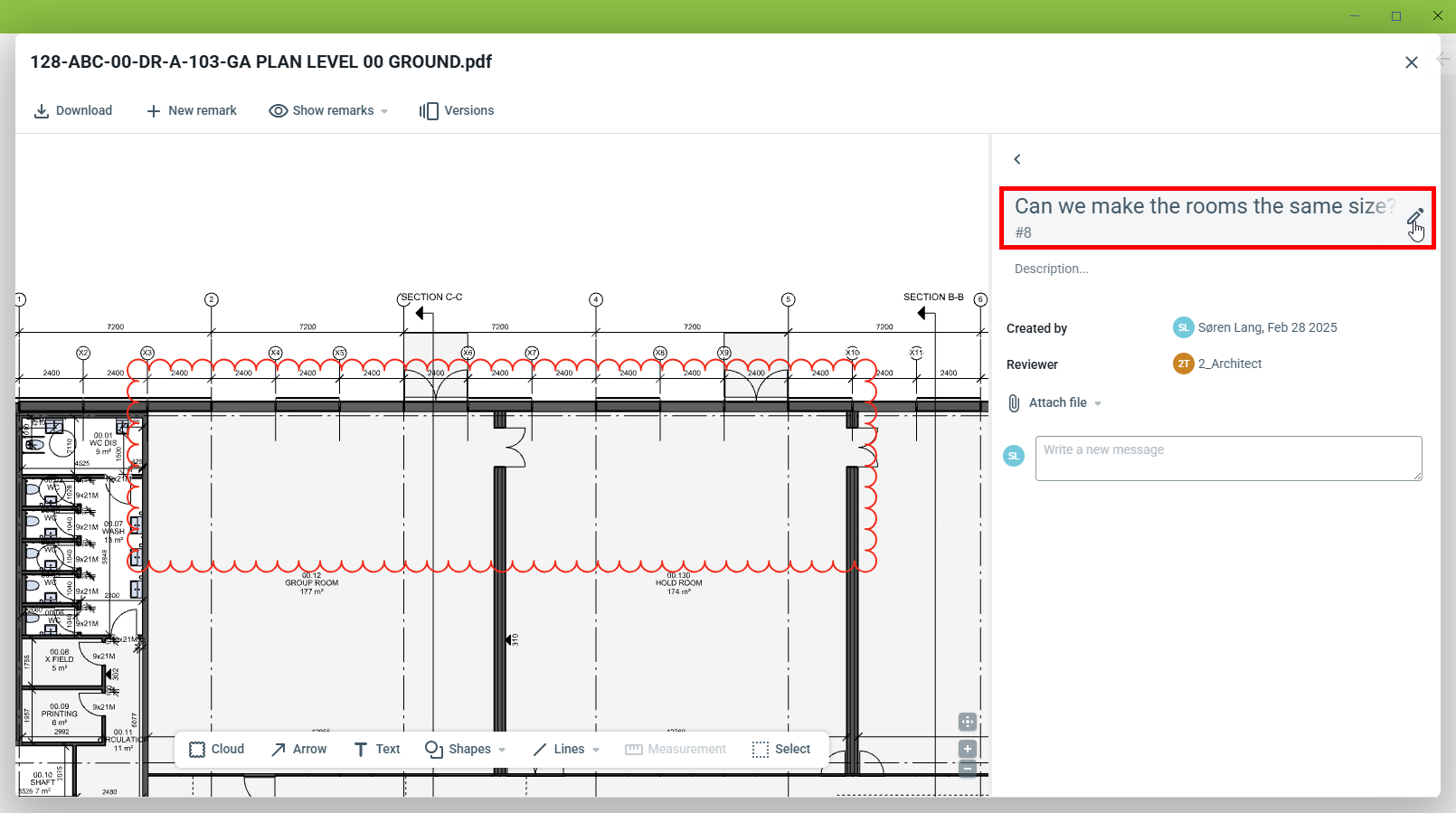 Je kunt een opmerking openen door op de markering of vanuit de lijstweergave in het zijpaneel te klikken. Het is dan mogelijk om een bericht aan de opmerking toe te voegen. Elke gebruikersgroep in de beoordeling kan berichten aan elkaars opmerkingen toevoegen.