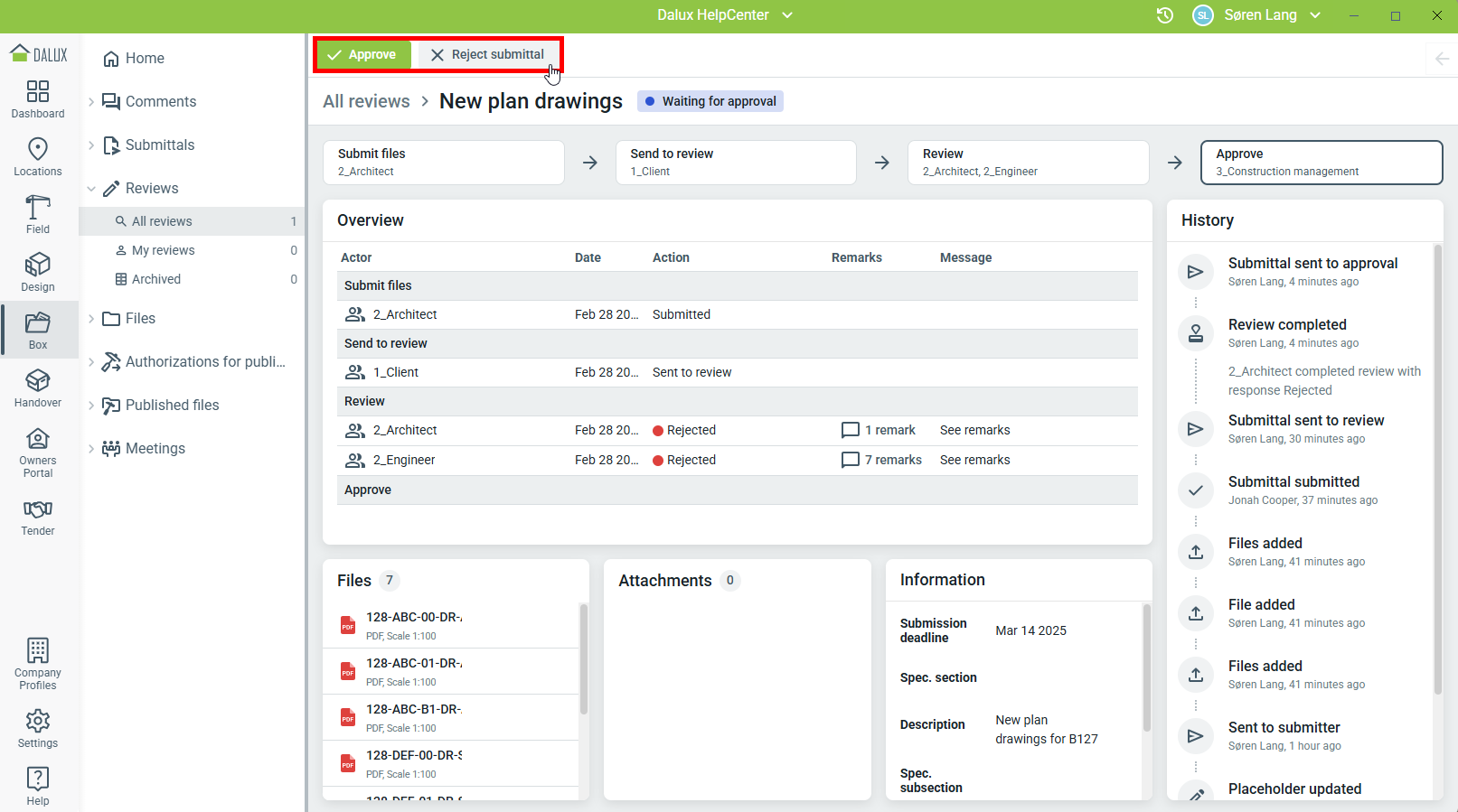 Klikken op Goedkeuren zal de inzending onmiddellijk goedkeuren en de actie kan niet ongedaan worden gemaakt. Projectbeheerders, projectmanagers of Review managers kunnen de Submittal nog steeds verwijderen.