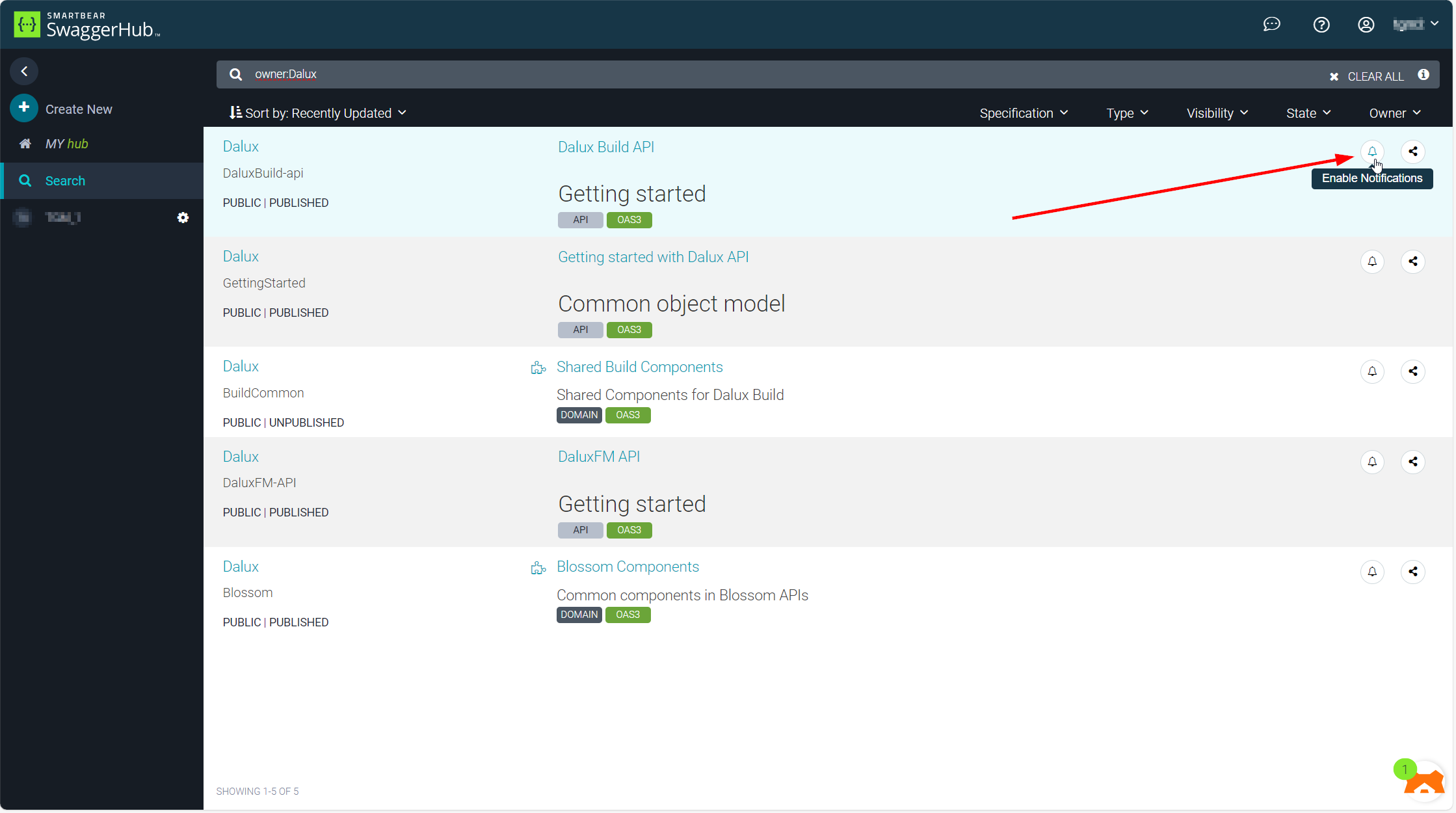 Om ervoor te zorgen dat je op de hoogte blijft van wijzigingen in de API, schakel je meldingen in voor de verschillende pagina's op SwaggerHub. Gebruik daarvoor de zoekopdracht om alle Dalux-pagina's te zien: 'owner:Dalux'.