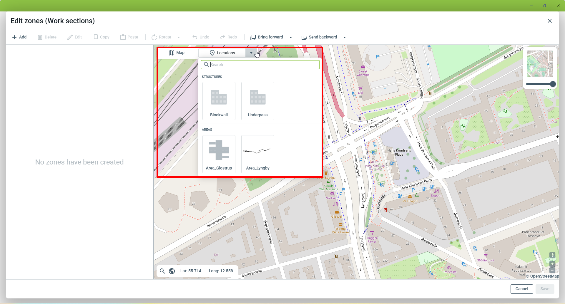 Musisz wybrać, gdzie dodać strefy, między 'Mapa' lub 'Obszar' lub 'Struktura' z Lokalizacje.