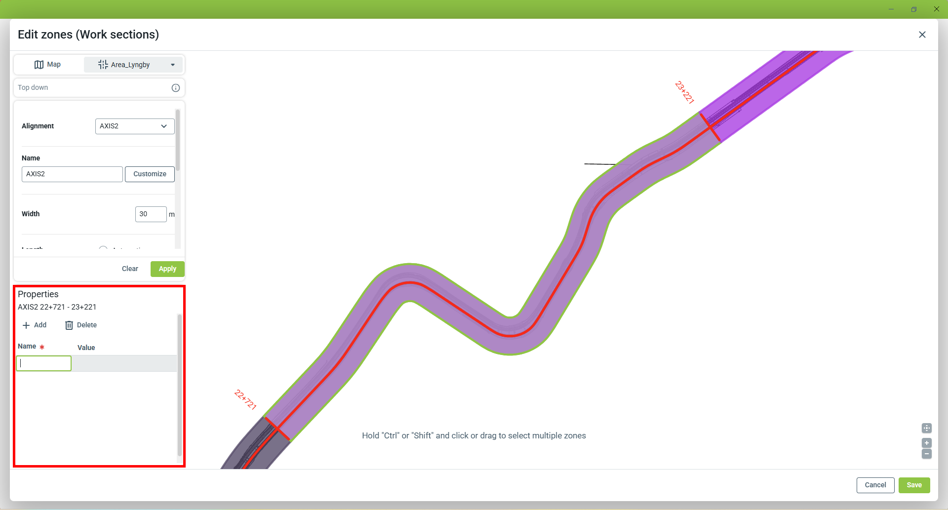 Użyj stref, aby podzielić projekt na mniejsze segmenty o określonych właściwościach lub do celów filtracji. Zaleca się utworzenie stref na początku, ale dodanie stref później automatycznie zaktualizuje już umieszczone rejestracje.