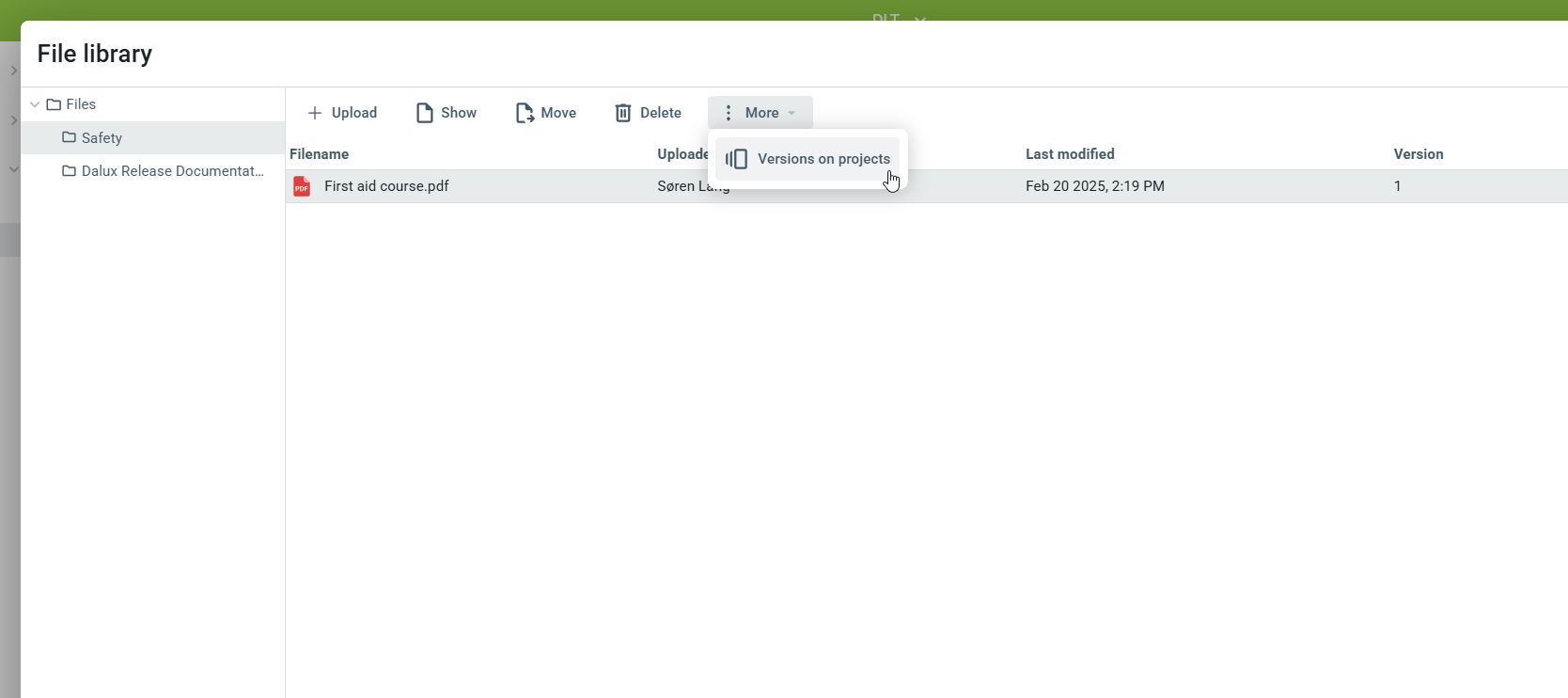 Filer kan också manuellt läggas till på projekt. Detta görs i en Boxmapp genom att klicka på Mer och sedan