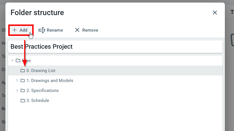 'Filer' kommer alltid att vara den översta mappen i mappstrukturen. Undermappar skapas för den valda mappen i listan. I exemplet nedan är mappen '0. Ritningslista vald, så om du klickar på Lägg till läggs en undermapp till i '0. Ritningslista'.