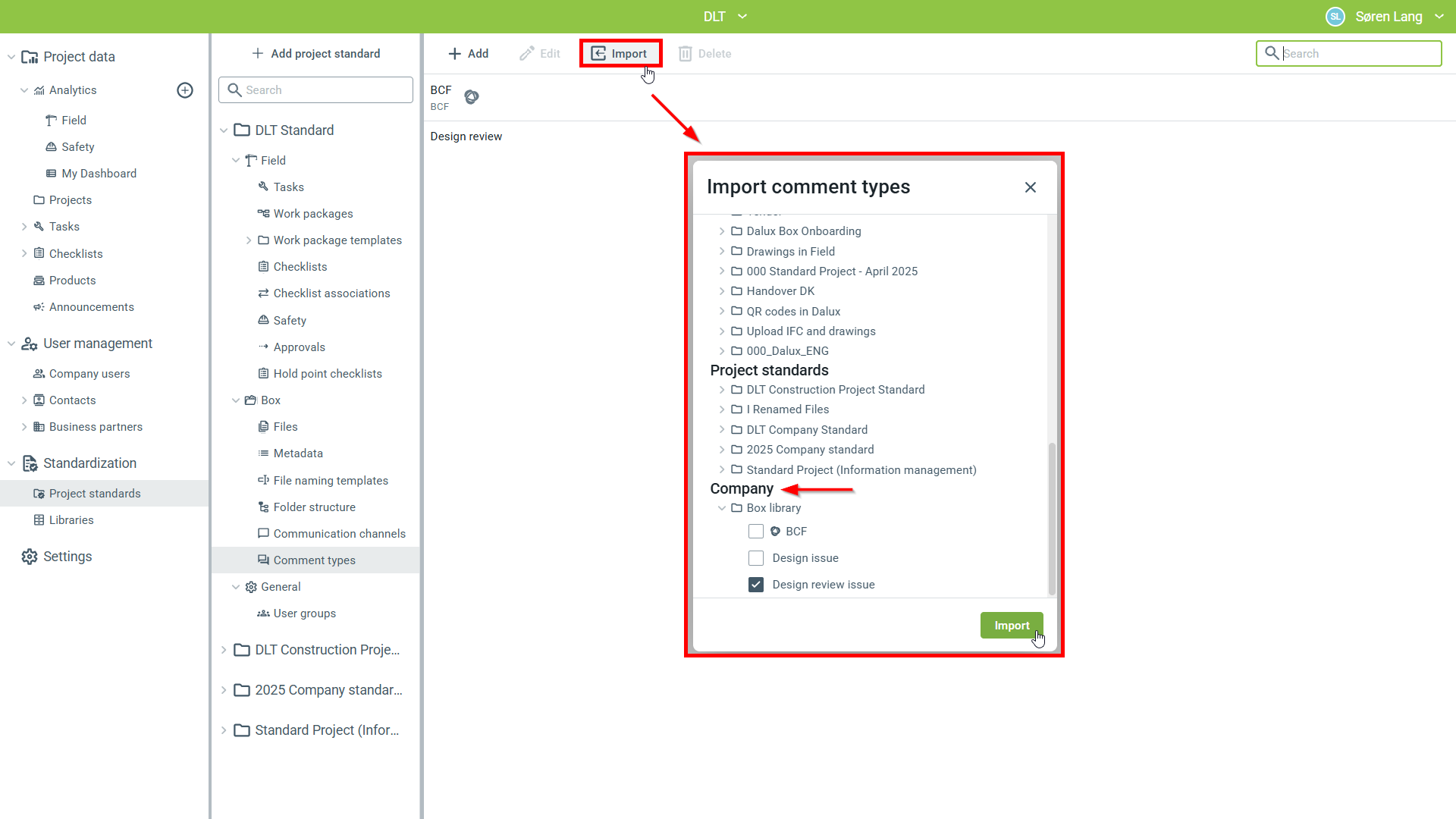 Du kan sedan importera kommentartyperna till projektstandarder genom att klicka på Import och välja dem från listan.