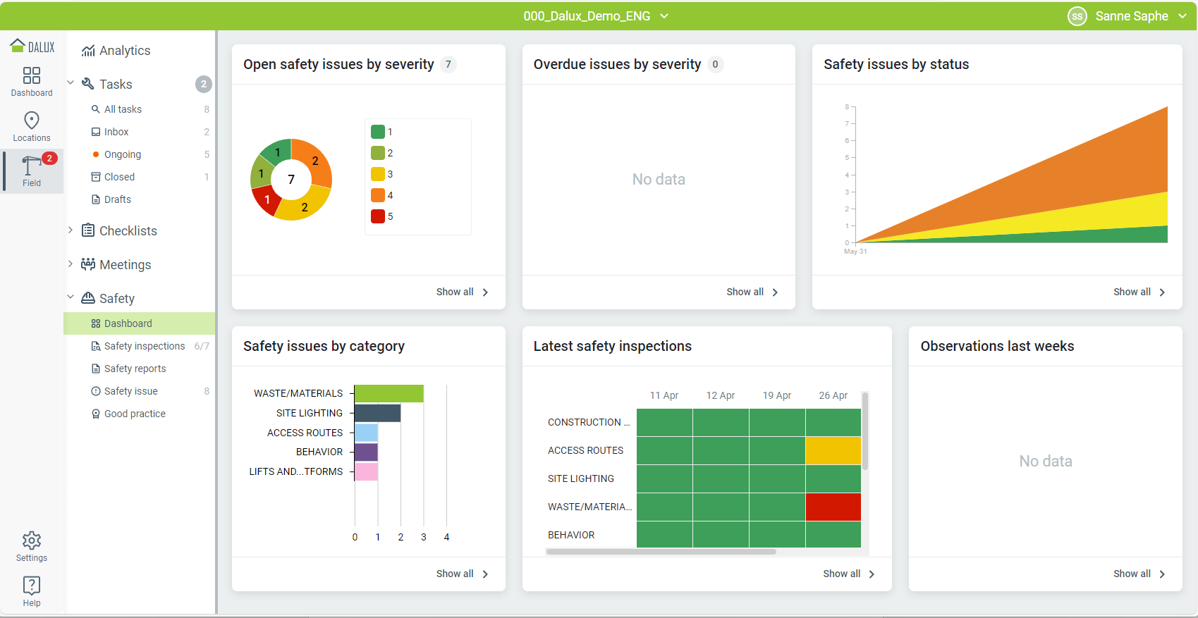 Skyddsronder och ärenden kan spåras under fliken arbetsmiljö, där säkerhetsansvarig kan få en översikt över säkerheten på plats.