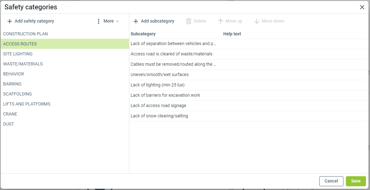 Underkategorierna används för att kommunicera varför säkerhetsansvarig identifierat ett ärende och vad entreprenören måste åtgärda.